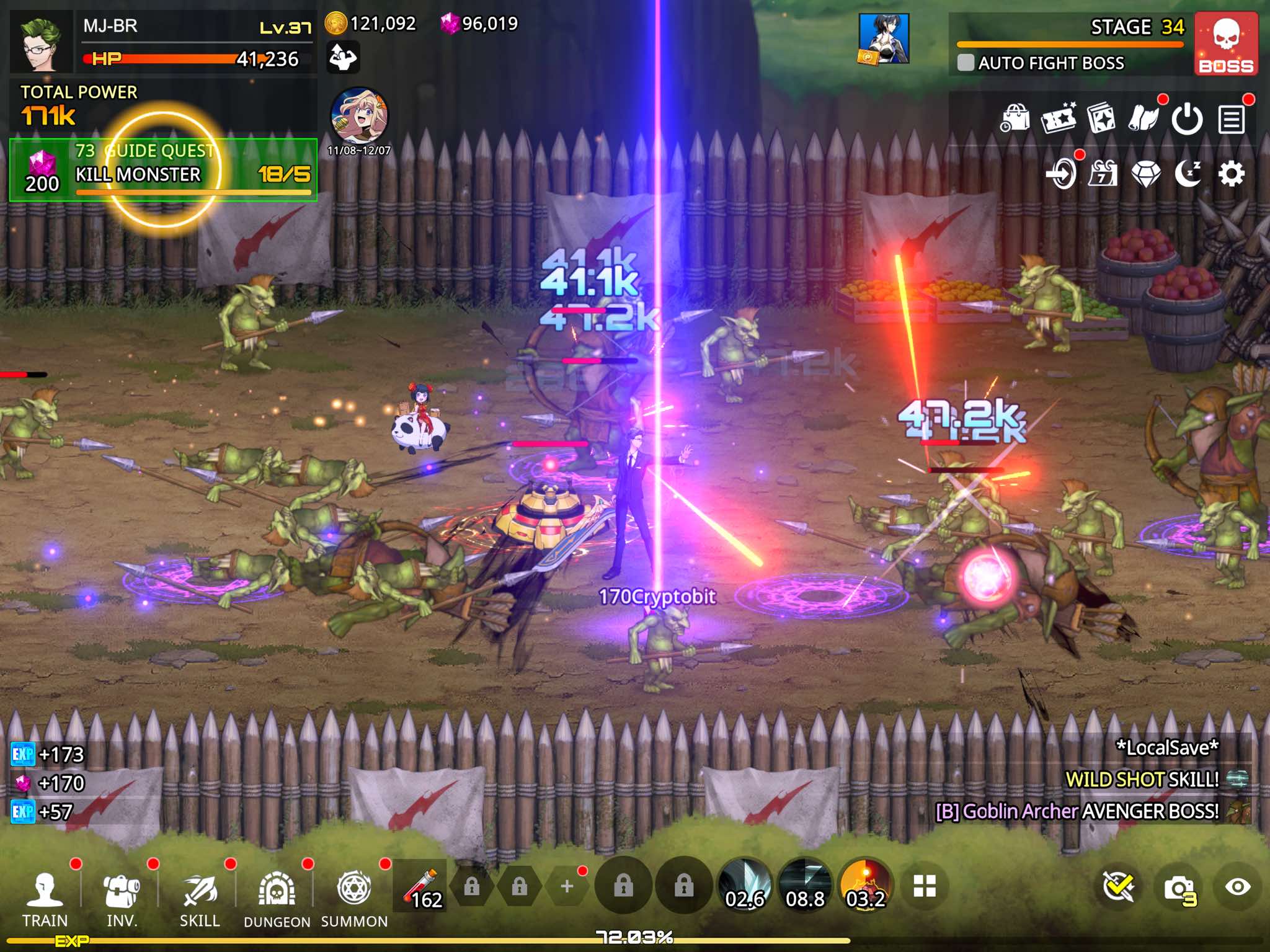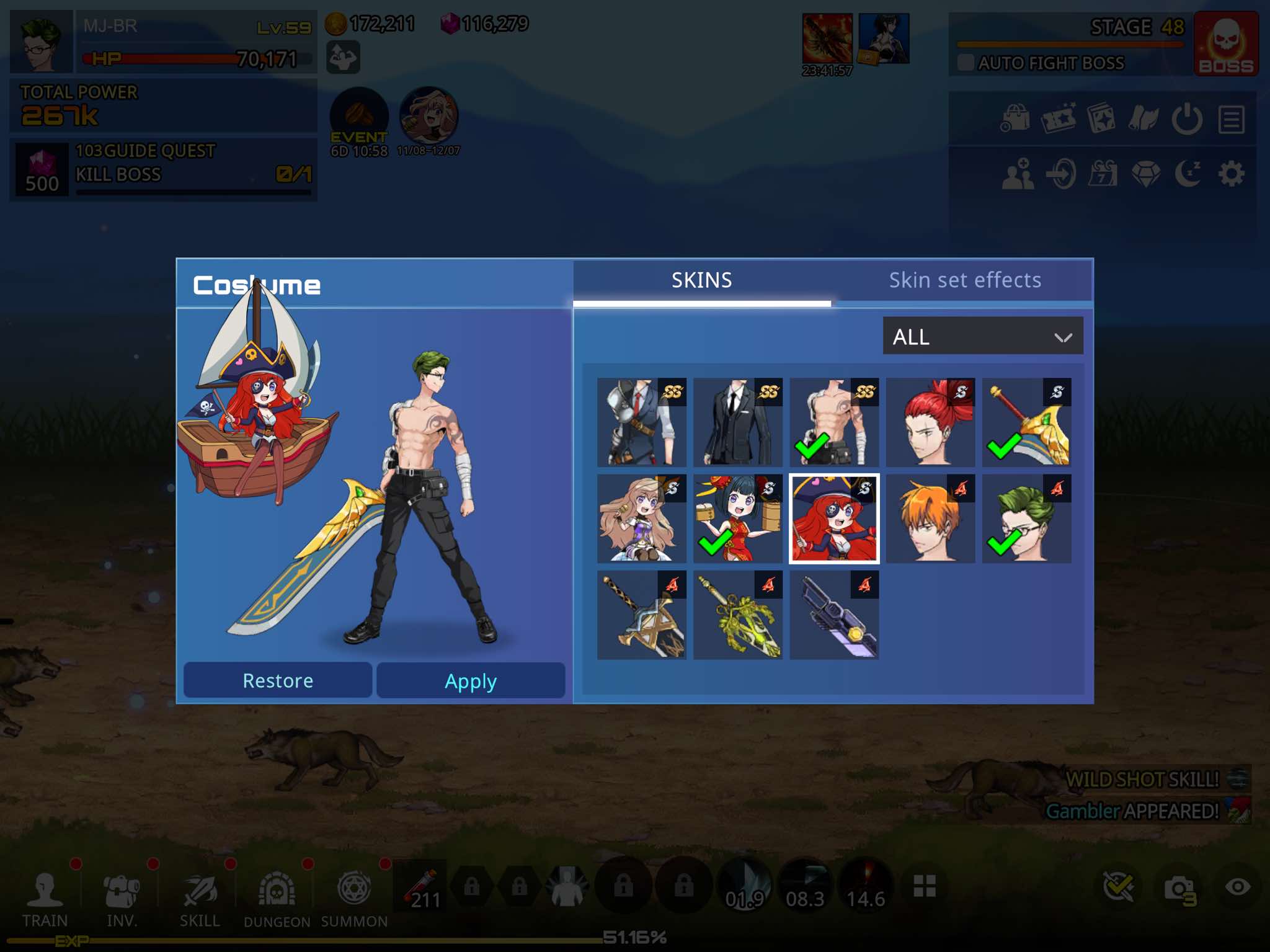 No matter which two, players will experience the impactful hits Mujin does to enemies. Afterward, they drop rewards such as Cryptobit for gears, spells, and Jenny upgrades and Coins for hero stats. Unbelievably, players get to grind out up to 100 gears to make the hero stronger in battle. Conveniently, aside from being able to promote equipment, Mujin can be equipped with the best ones with the push of a button. Not only can playing idly get you anywhere, but cosmetics for the hero and Jenny come with beneficial buffs to aid even more in battle. You know the rules: the higher the rarity, the stats.