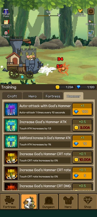 Stats management is found in the Training menu. It’s categorized as Craft, Hero, Fortress, and Hammer. On the less clear subdivisions, Craft refers to the kind of weapons your forge produces, and Hammer is a player-triggered attack done by repeatedly tapping the screen. You can upgrade parameters in two ways: by using Gold that can be farmed in-game or through Gems you can get by completing missions or making in-app purchases. Upgrading is more streamlined in this game compared to similar team management or idle hero collector titles. There’s no need to spam or repeatedly tap the upgrades to feel progress here. You will also have to wait longer for funds to accumulate so that you can level up a needed stat.
