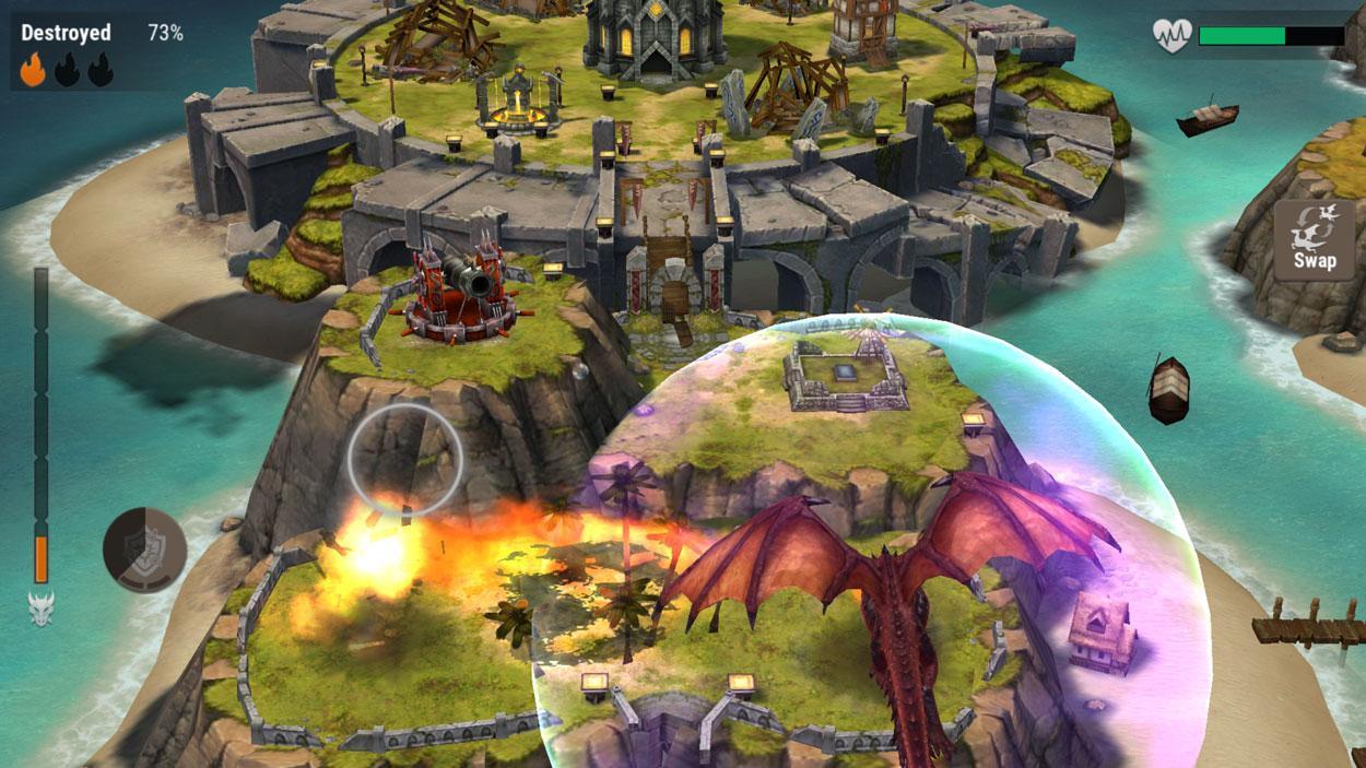 Each dragon can be leveled up and trained to increase its stats and sometimes to unlock some cool abilities. For instance, Draco will gain a special shield ability that when activated, will absorb a certain amount of damage before exploding and destroying any buildings nearby. To activate these abilities though, you’ll first need to attack enemy structures to rack up some Rage points. Dragons can also be equipped with runes or boosts to further enhance their destructive abilities.