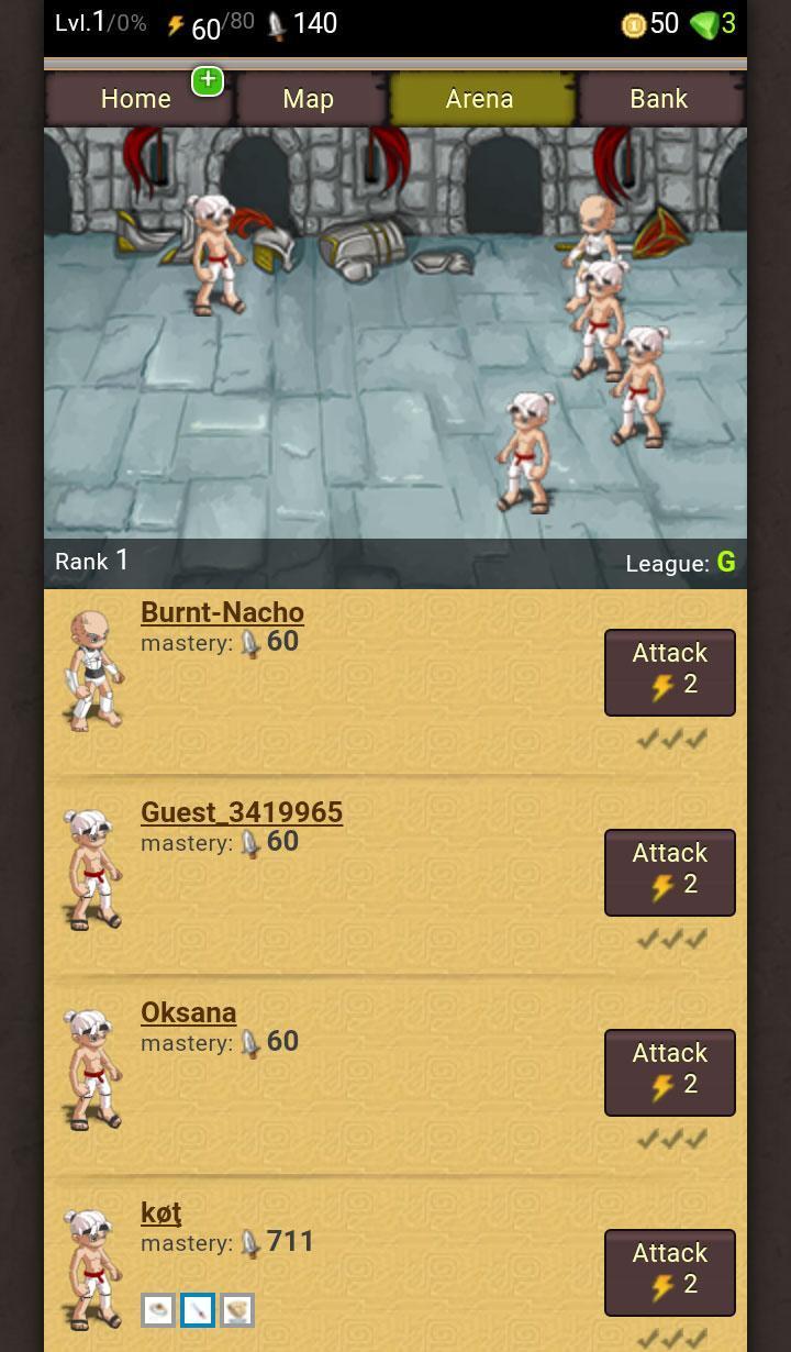 Players will be able to battle against players in the arena, but they will be facing harder foes when they reach higher arenas. Players will be able to reach higher arenas after they beat three foes in a certain arena group division. It might be challenging to gain levels in order to get stronger but players may also do quests in order to gain free items and additional experience.