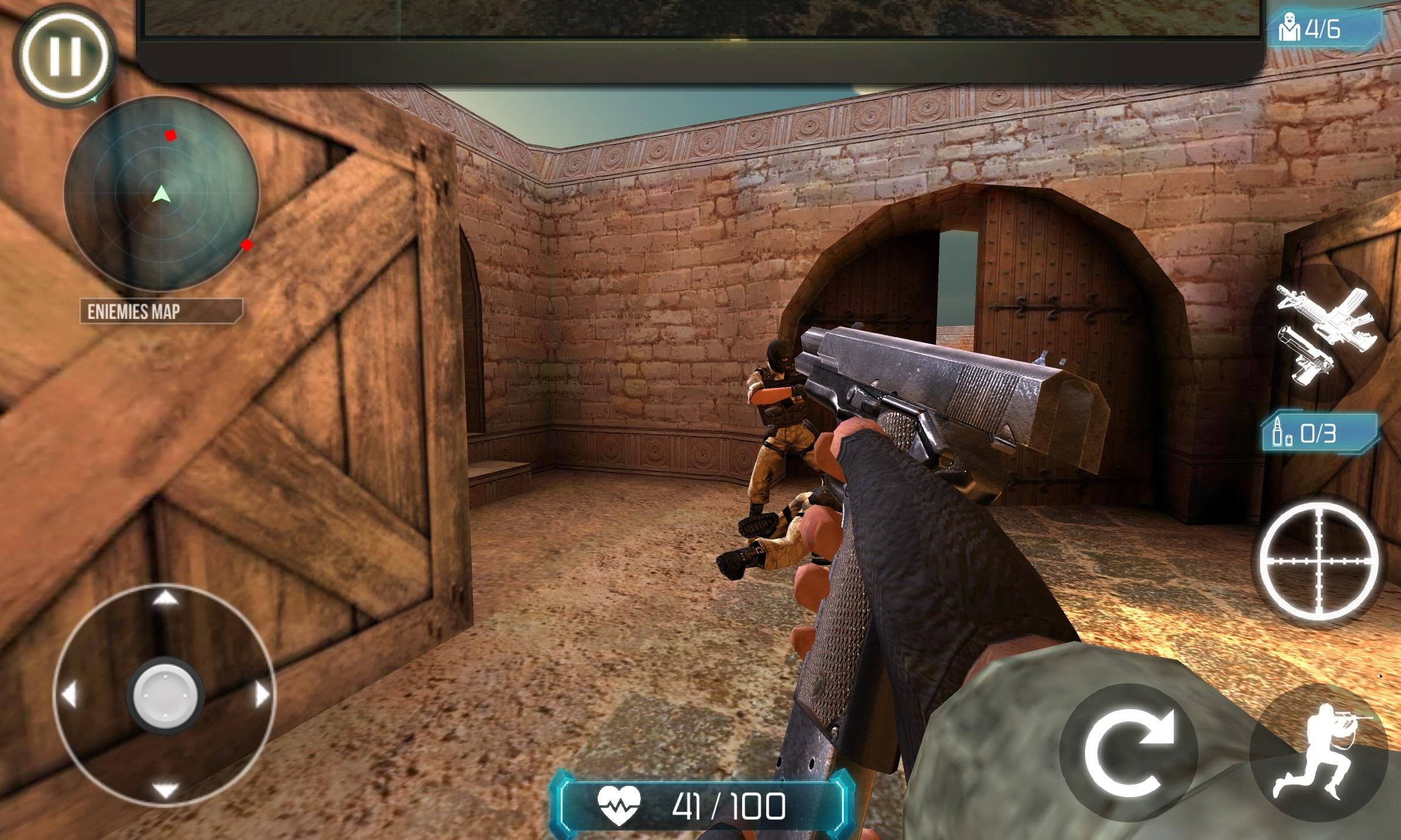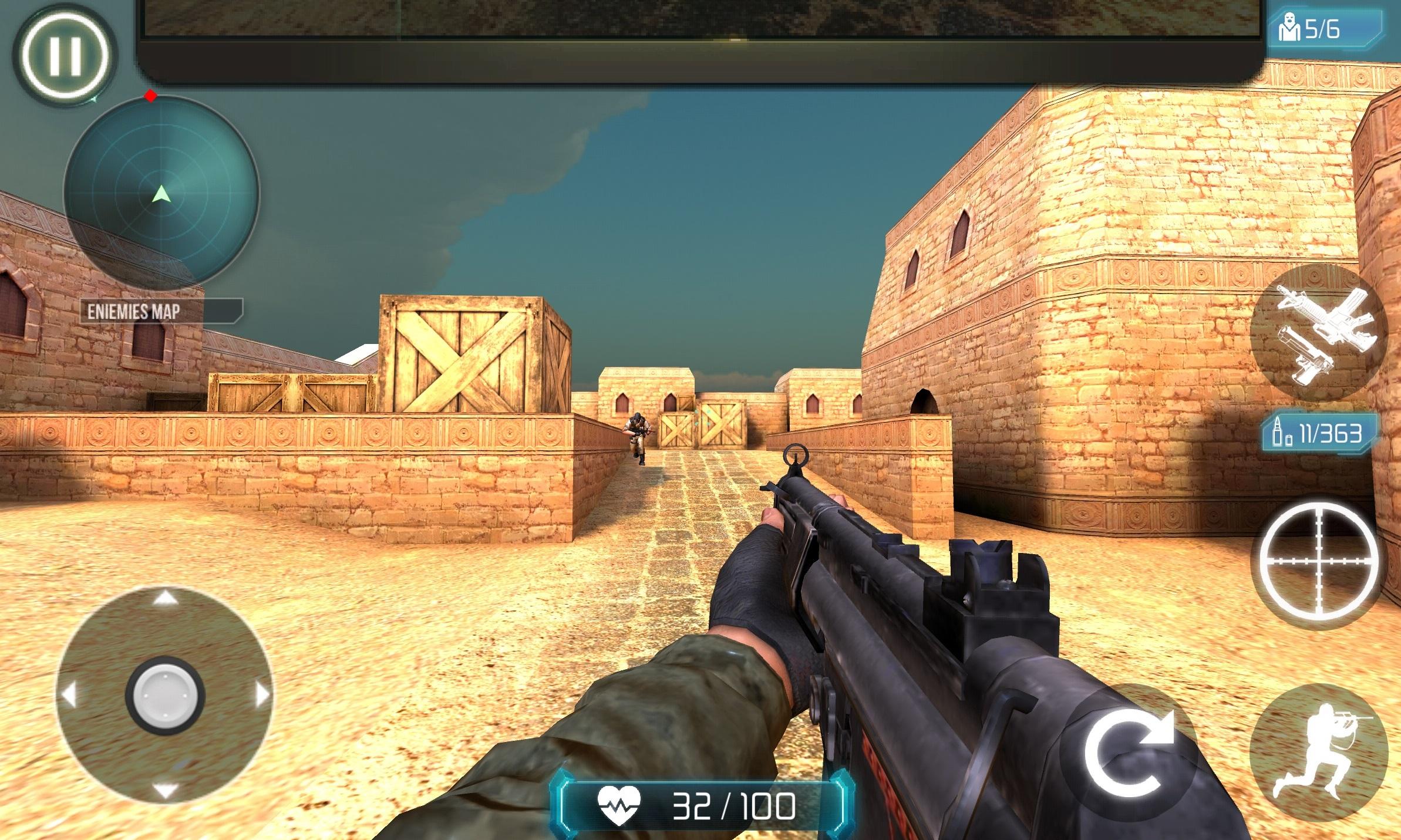 There are five epic guns in Counter Terrorist: SWAT Strike. These include MP5, M4, AK 47 and a Sniper Rifle. You can get your hands on the meanest fire power by purchasing them through coins earned in the game. Moreover, you can also buy extra ammunition just so that you can never run out of ammo during battle. Besides these primary weapons, you also get a knife as well as a pistol that you can use in case of close ranged targets. Simply tap the on screen button to switch weapons.